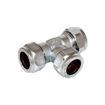 22mm x 15mm Compression Tee Brass Chrome Plated. Suitable for hot and cold drinking water, heating and chilled water systems. Max Pressure 20 Bar - Working temperature -15°C to +120°C. Manufactured to comply with EN 1254-2, WRAS approved.