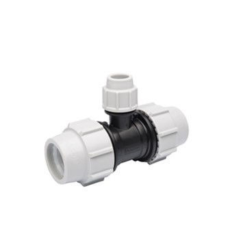 Plasson reducing tee with 32mm x 25mm POL x POL end connections, ISO 17885 for Water Applications, AS/NZS 4129, ISO 7/1, BS 21, DIN 2999, UNI 9561, NEN 3258, AS 1722, DIN 8076, WRAS