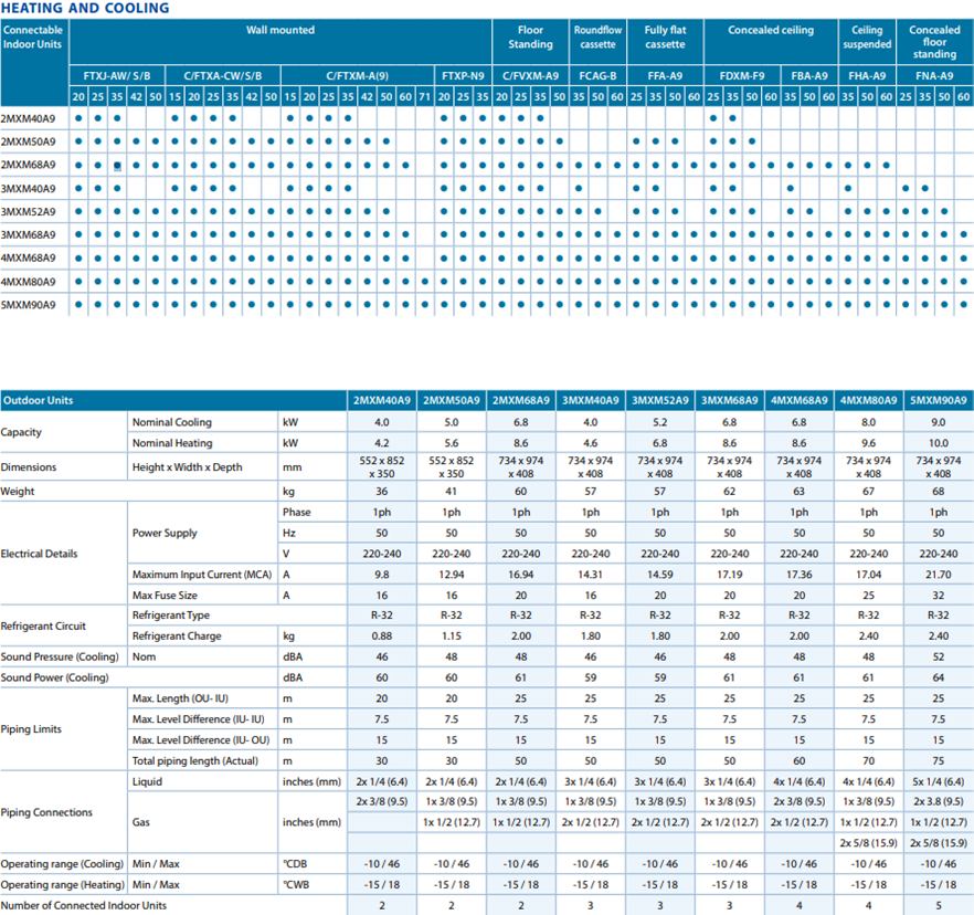 Multi Series R-32 Inverters offer the ability to connect up to five fan coils to one outdoor unit. With the MXM range it is possible to install indoor units throughout a house or small commercial premises and only use one outdoor unit. Each indoor unit will have its own controller and will be able to operate in heating and cooling modes.